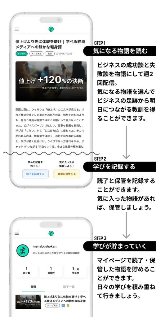 ビジネスの成功談と失敗談を物語として提供する月額550円(税込)の有料会員制オンラインサービスです。会員登録いただくことで、すべての物語が読み放題となります。